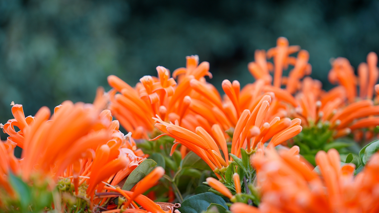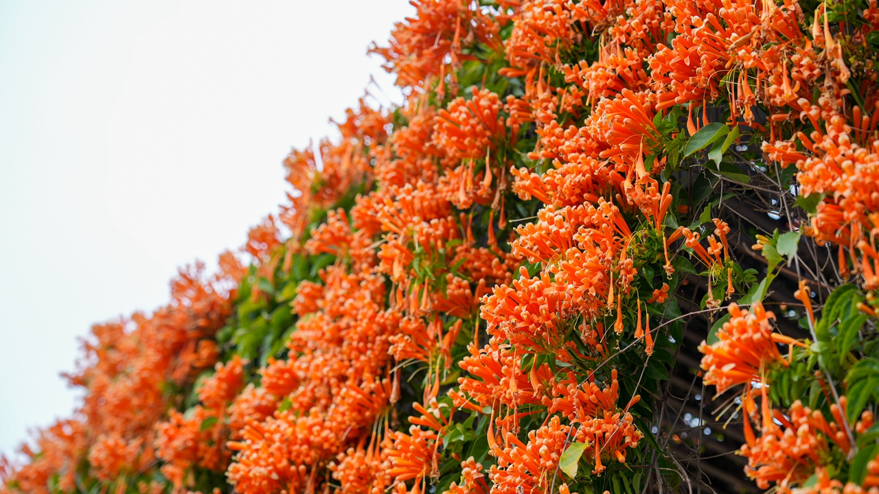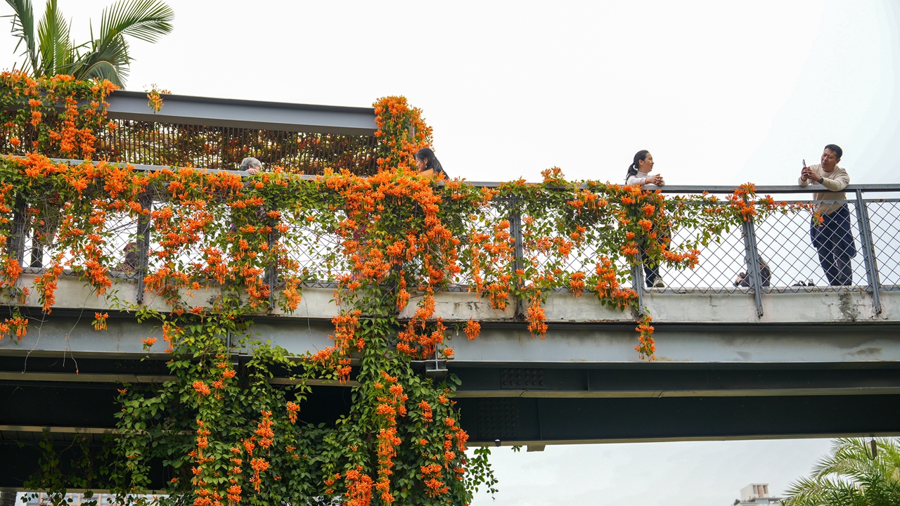 Named for their resemblance to clusters of firecrackers, the cannonball flowers feature vibrant orange-red blossoms that hang in long rows. They now create a unique floral landscape within Shenzhen’s parks, with their blossoms flowing downward like cascading waterfalls.
