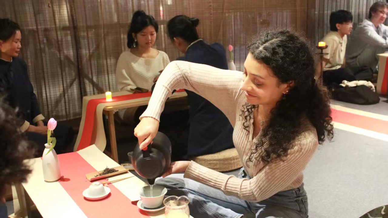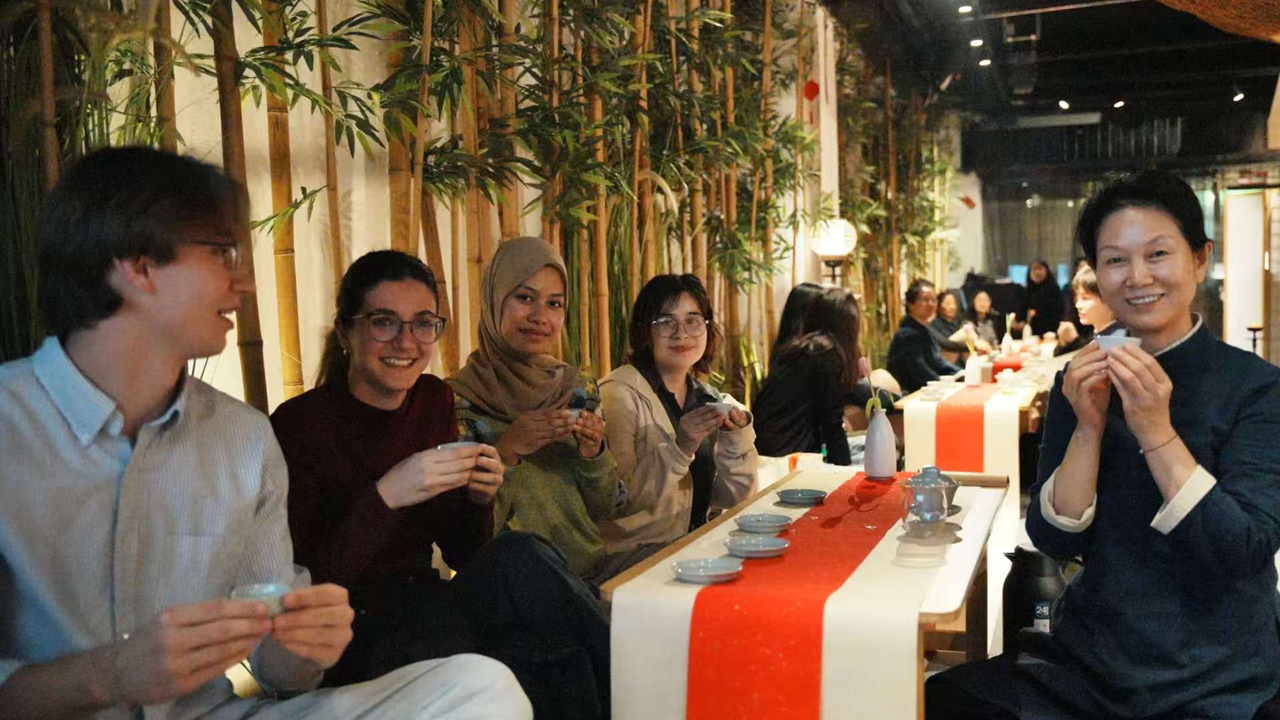 The group, composed of degree-seeking and exchange students from countries including Germany, Indonesia, Italy, Kazakhstan, Mexico, the U.S., and other nations, spent the session learning tea philosophy, sampling brews prepared by professional masters, and practising the rituals of tea preparation. They gained hands-on experience in brewing and savoring teas steeped in millennia of heritage.