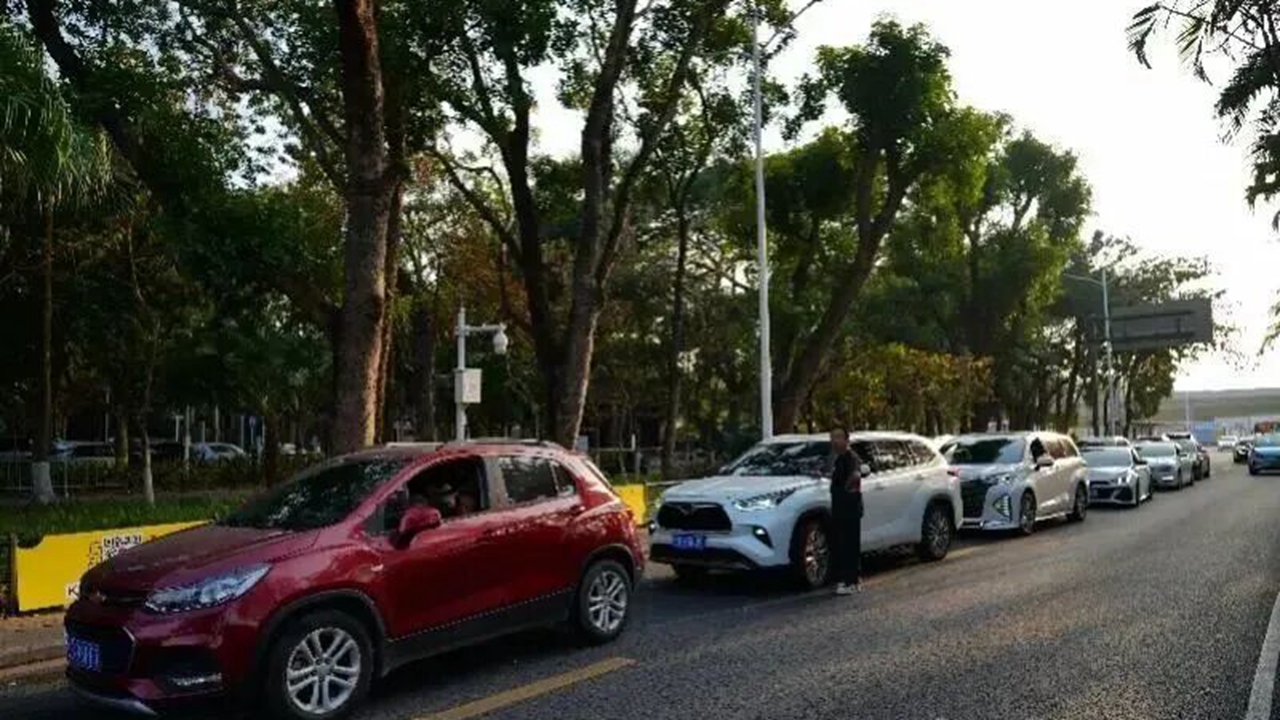Vehicles line up at the entrance to Shenzhen Bay Park’s Lot 1 on Wednesday evening. The lot is located near the park’s bird-watching area, which typically draws heavier visitor traffic.