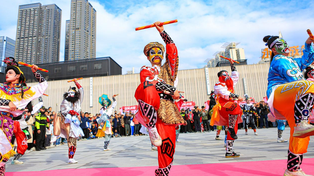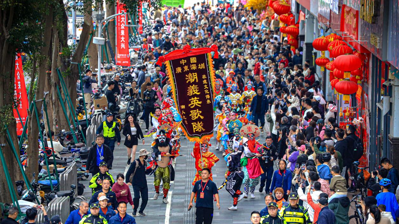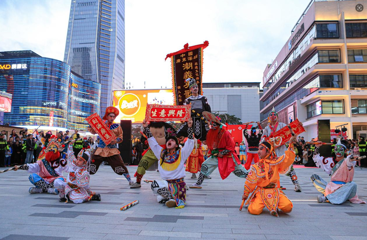 Performers in full-face paint and vibrant costumes bring the centuries-old Yingge Dance to life during a lively outdoor performance in Luohu’s Sungang Subdistrict.
