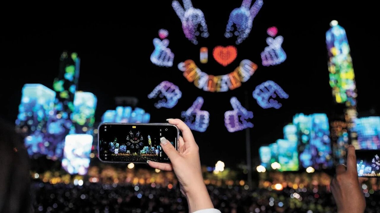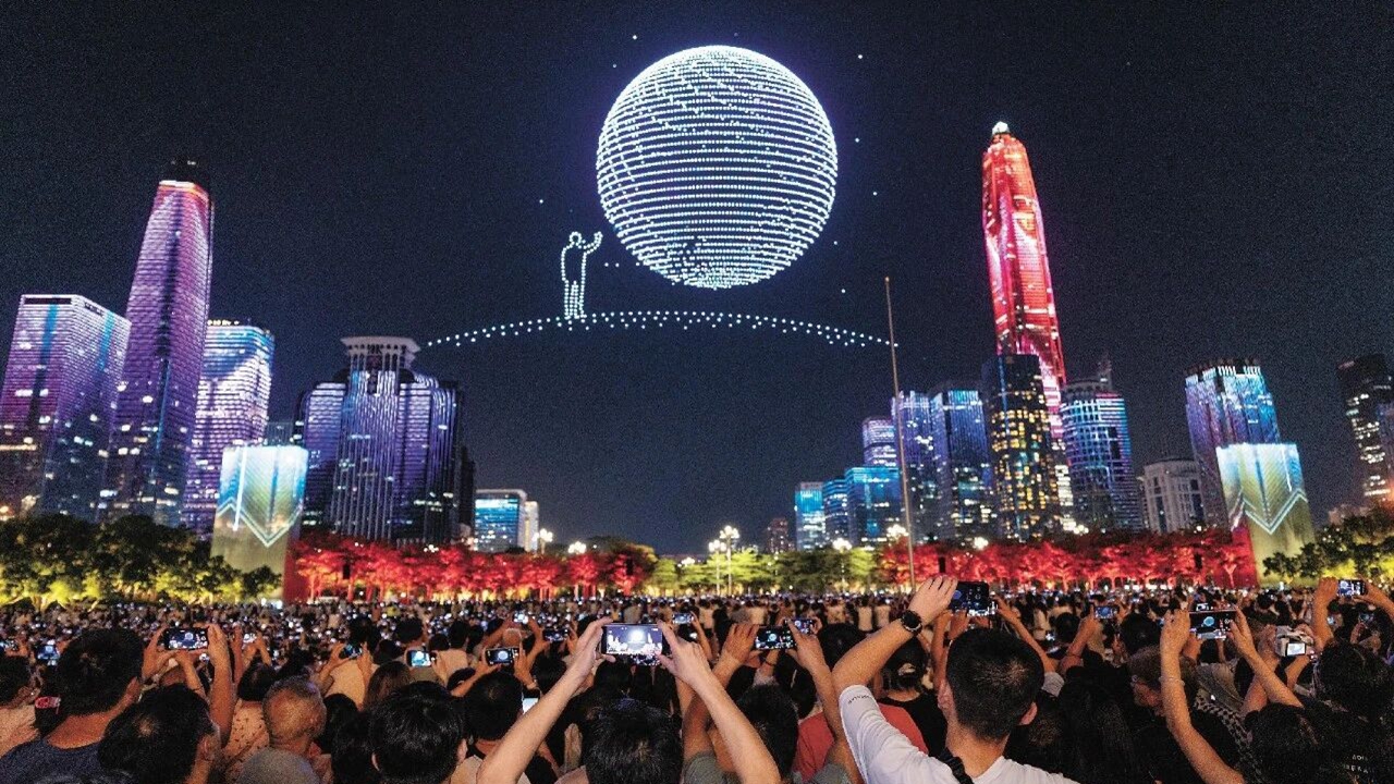 A festive drone formation lights up the night sky over Futian during the Shenzhen Special Economic Zone's 45th anniversary celebration. Shenzhen Special Zone Daily