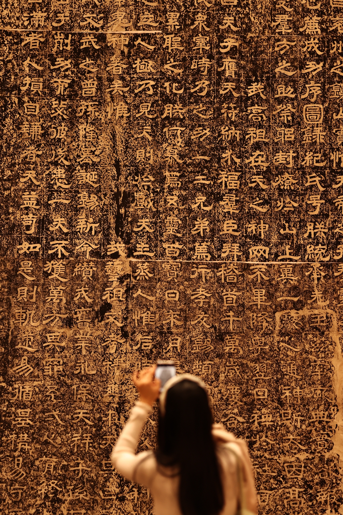 A visitor takes photos of an exhibit from the Chinese epigraphic rubbings exhibition at Shenzhen Art Museum (Longhua Division). Liu Xudong