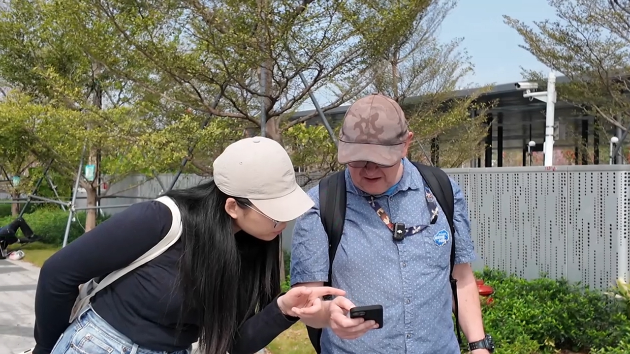 Andrew from the U.K. (R) shows photos about public signs he has taken to an EyeShenzhen reporter.