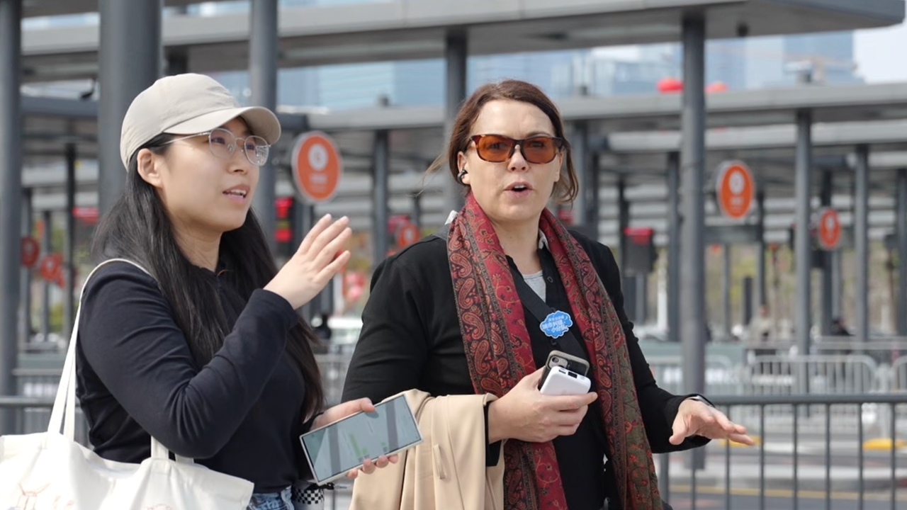 Jennifer from Australia (R) shares her thoughts about public signage in Shenzhen with an EyeShenzhen reporter.