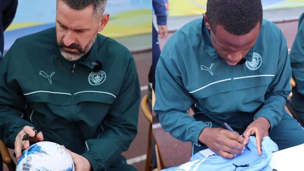 Scott Carson (L) and Nedum Onuoha sign footballs and jerseys for students.