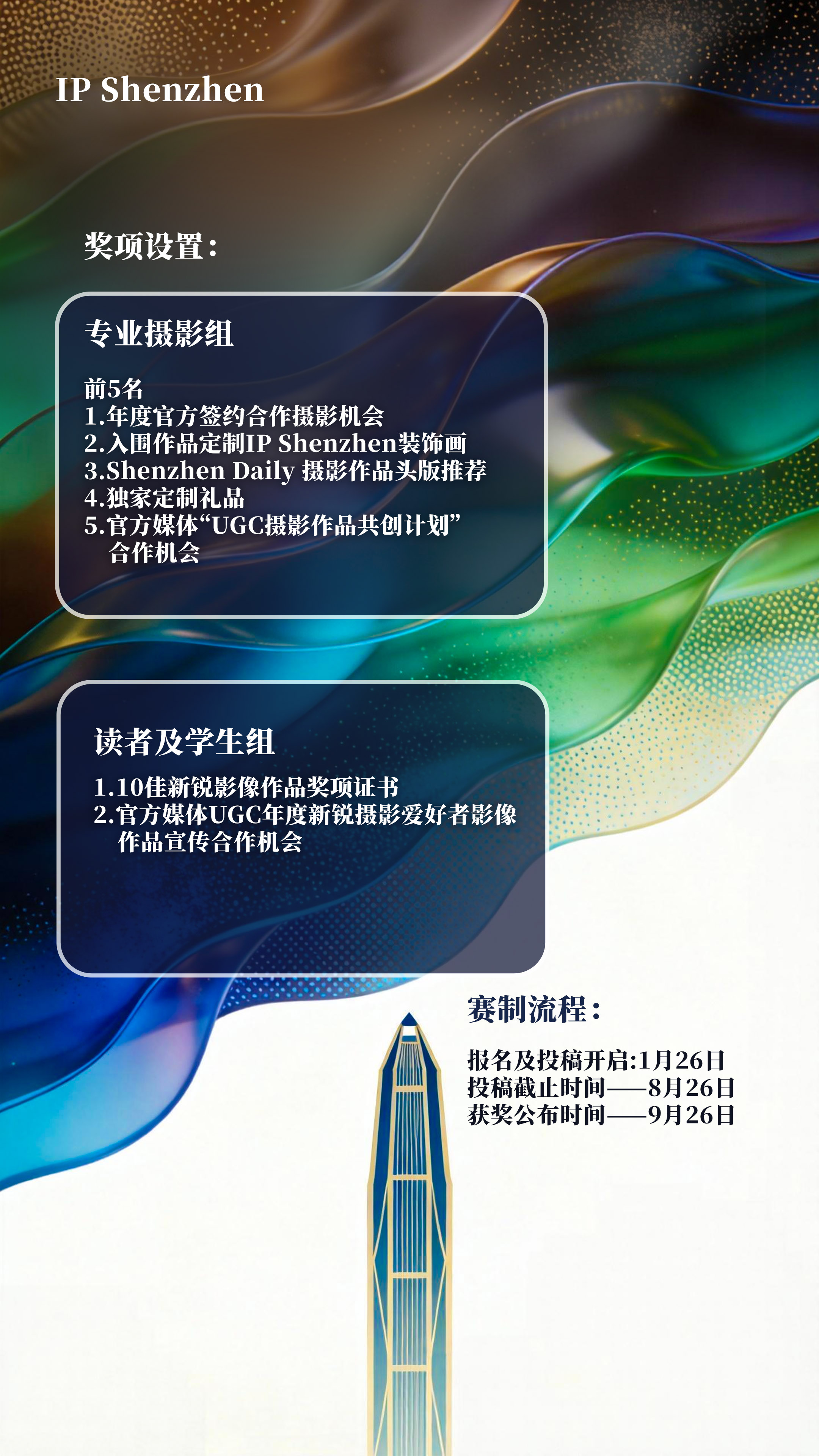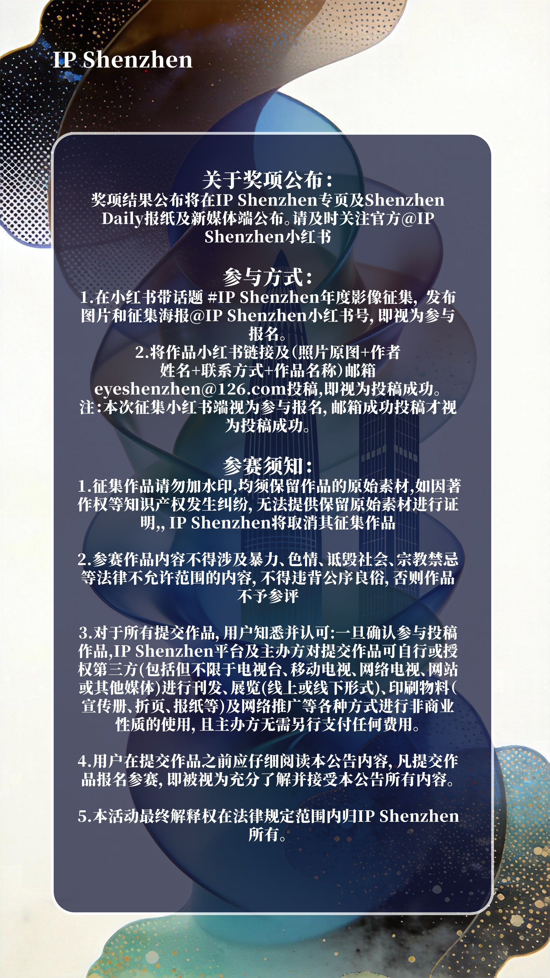 1. Post your images on Xiaohongshu (RED) with the hashtag #IPShenzhen年度影像征集, tag @IP Shenzhen, and include the campaign poster — this will serve as your registration.