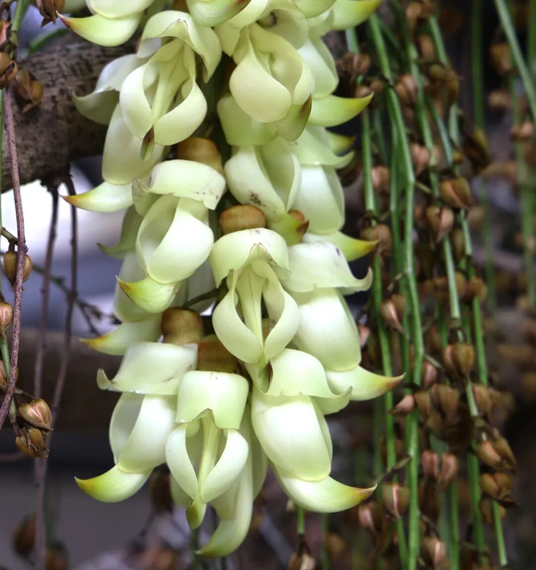 Mucuna birdwoodiana, commonly known as sparrow flowers for their distinctive sparrow-like shape, is a national second-class protected species. This year, the landscape around Jingui Village in Pingshan District has been transformed into a sea of these enchanting blooms — especially the rare white-flowered variety. Thriving in warm, humid conditions, sparrow flowers reach peak vibrancy in Shenzhen from March to early April. Their clusters of delicate petals dangle like fluttering sparrows, creating a breathtaking display that seems almost too magical to be real.