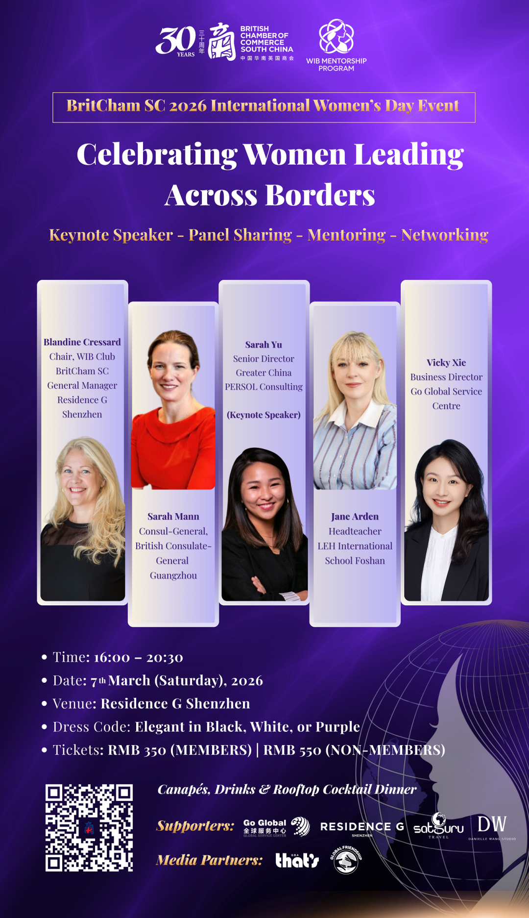 In celebration of International Women's Day and in response to the growing need for women's leadership development in South China, the British Chamber of Commerce South China will host "Women Leading Across Borders: Building the Future Together" on March 7.