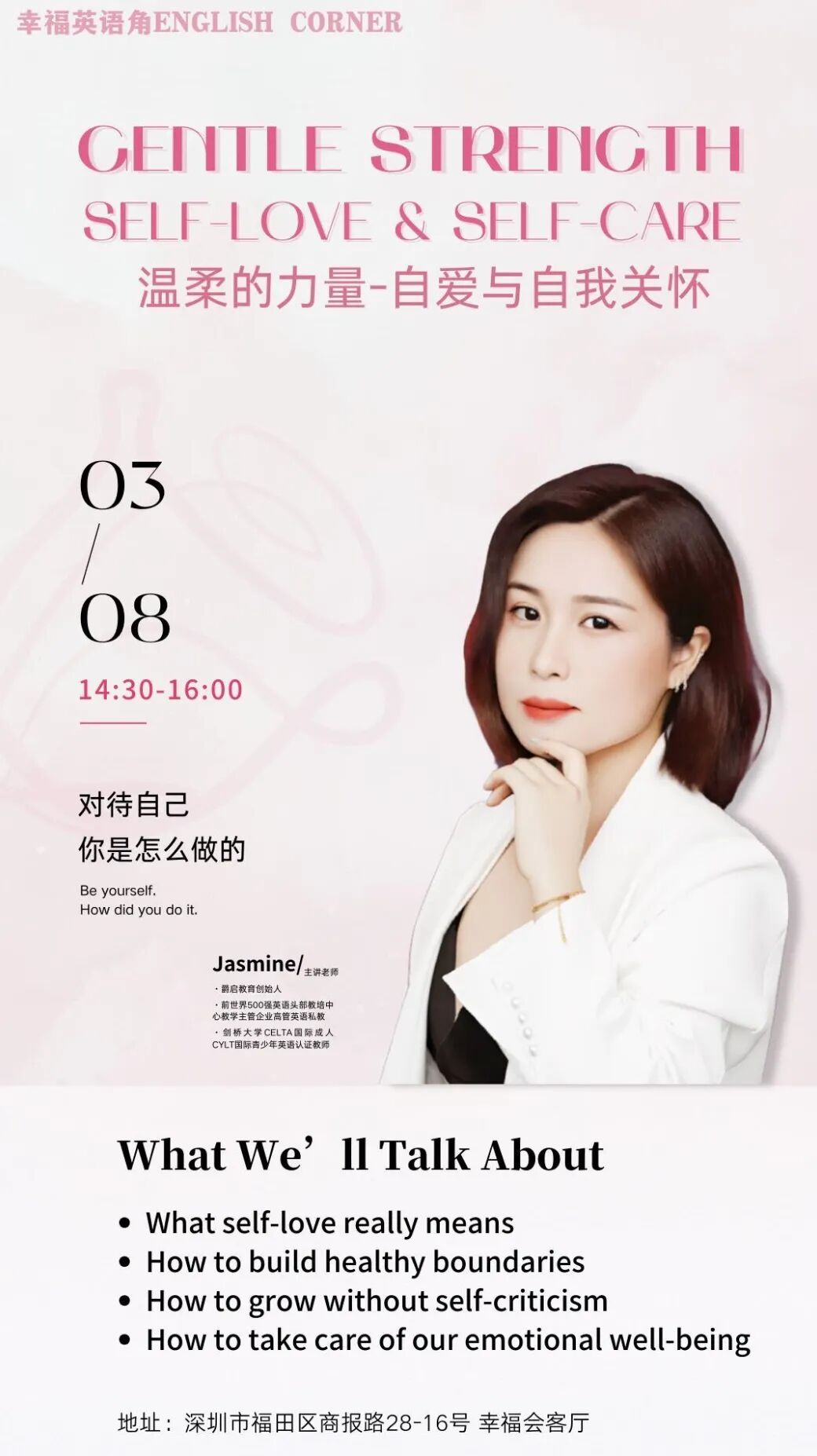 This Women's Day English corner focuses on self love, boundaries, and emotional awareness. In 90 minutes, participants will discuss what self love really means, explore the idea of inner critic, practice expressing personal thoughts in English, and engage in small-group interactive conversations.