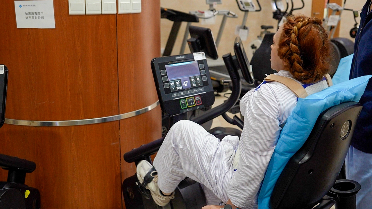 Irina Karabulatova undergoes rehabilitation training on an exercise machine at The University of Hong Kong–Shenzhen Hospital as part of her recovery after the spinal surgery.
