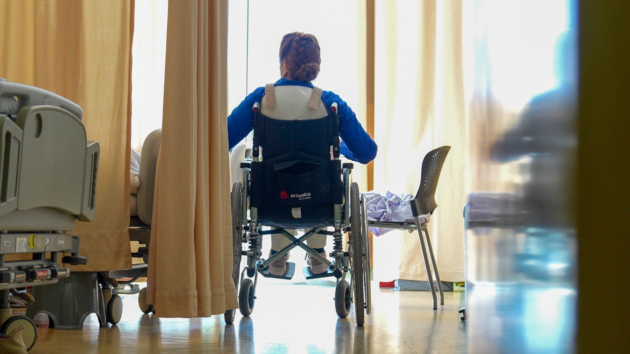 Irina Karabulatova sits in her wheelchair by a window in a hospital room at The University of Hong Kong–Shenzhen Hospital.