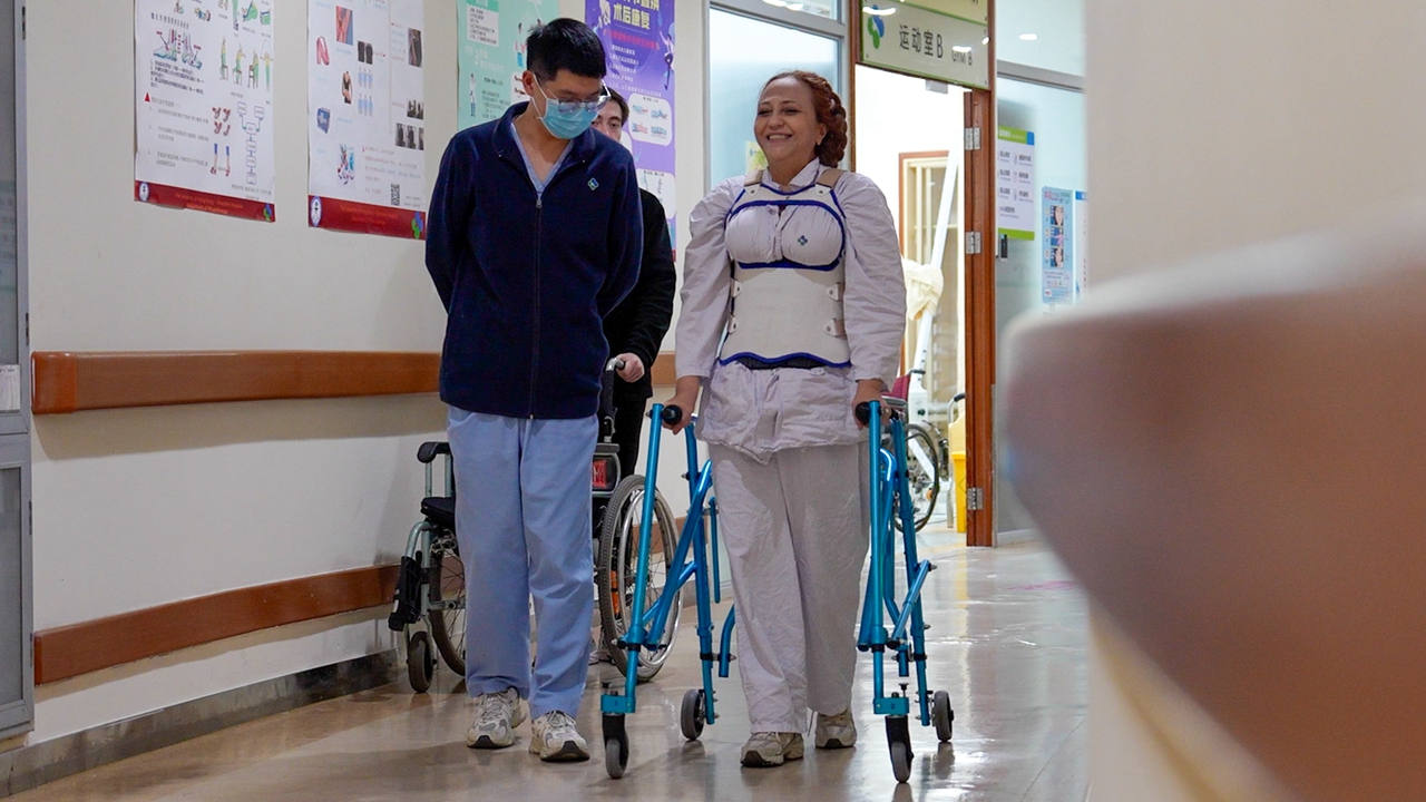 Irina Karabulatova walks with a walker during rehabilitation at The University of Hong Kong–Shenzhen Hospital, accompanied by a medical staff member, as she continues her recovery after spinal surgery.