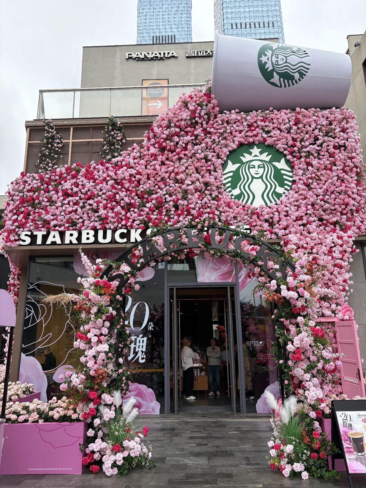 Starbucks has transformed its store at UpperHills in Futian District into a “rose garden” just in time for spring, making it the company’s first-ever rose-themed flagship store in China. Located on the third floor of the trendy lifestyle hub, the new flagship invites visitors to step through a rose-adorned door to join an immersive experience designed to celebrate the season in full bloom.