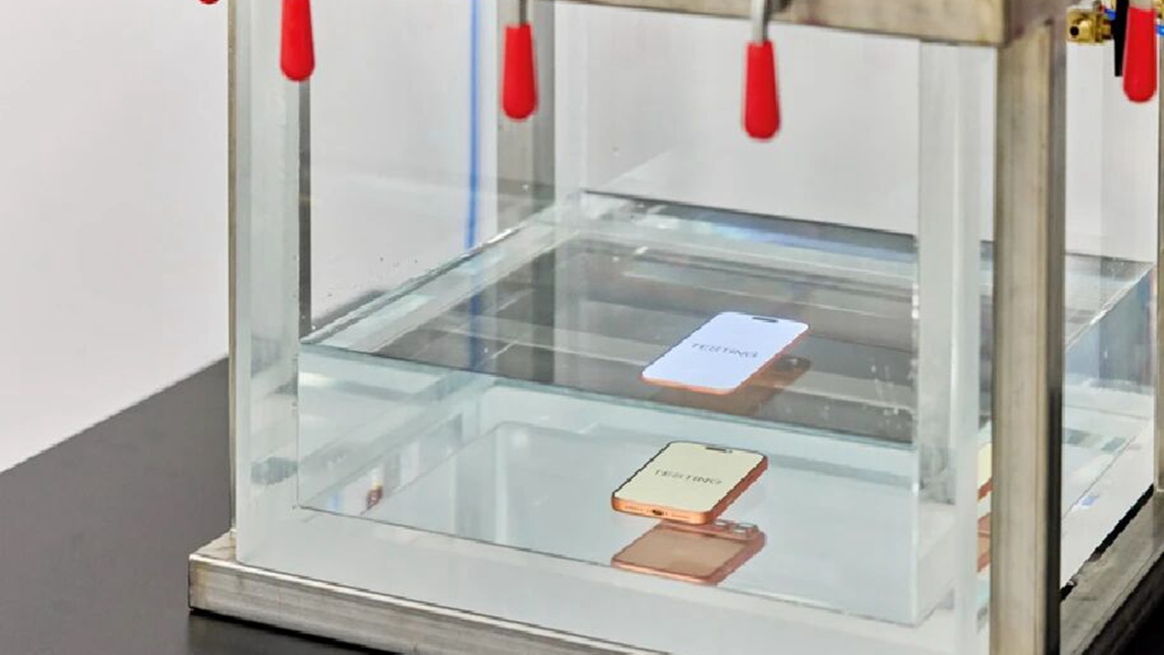 A phone undergoes an IPX8 waterproof test.