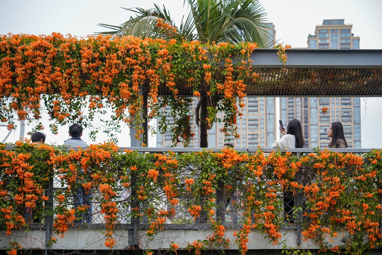 Named for their resemblance to clusters of firecrackers, the cannonball flowers feature vibrant orange-red blossoms that hang in long rows. They now create a unique floral landscape within Shenzhen’s parks, with their blossoms flowing downward like cascading waterfalls.