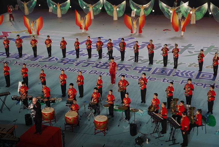 In a vibrant display of cross-cultural harmony, hundreds of teenagers from the U.S. and China came together for a large-scale marching band exchange gala at the University Town of Shenzhen Sports Center yesterday.