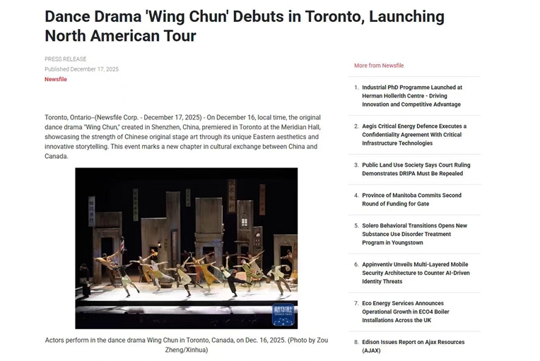 The premiere of acclaimed dance drama “Wing Chun” from Shenzhen in North American Tuesday evening (local time) received media attention in Canada.