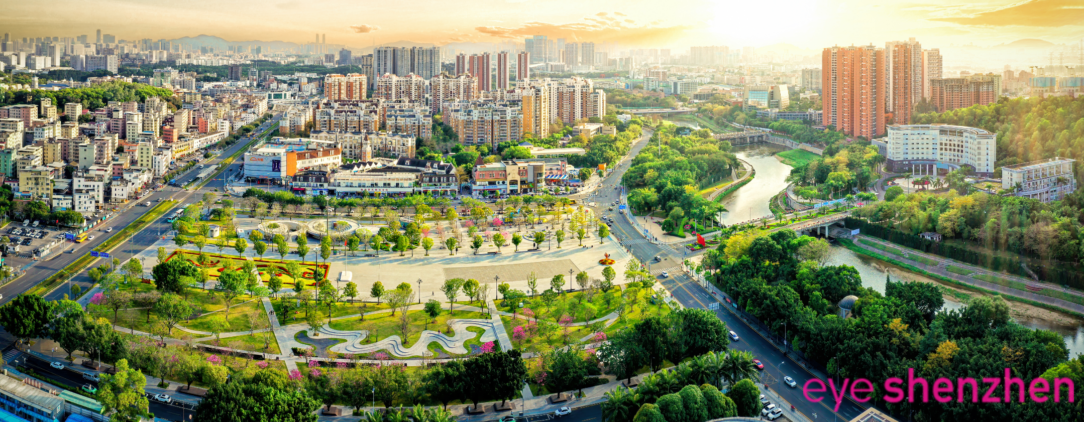 Golden dawn over Longhua District: aerial view