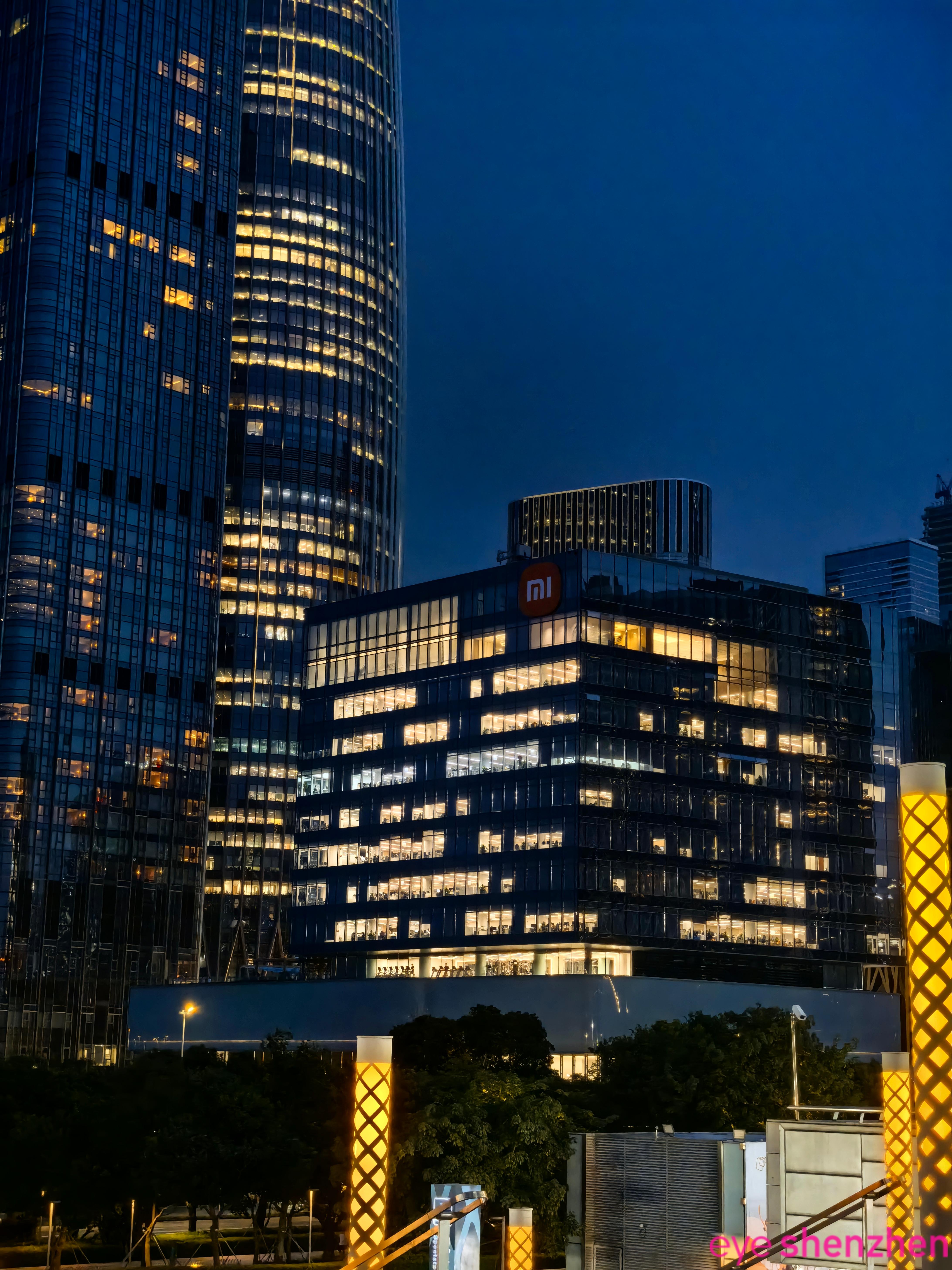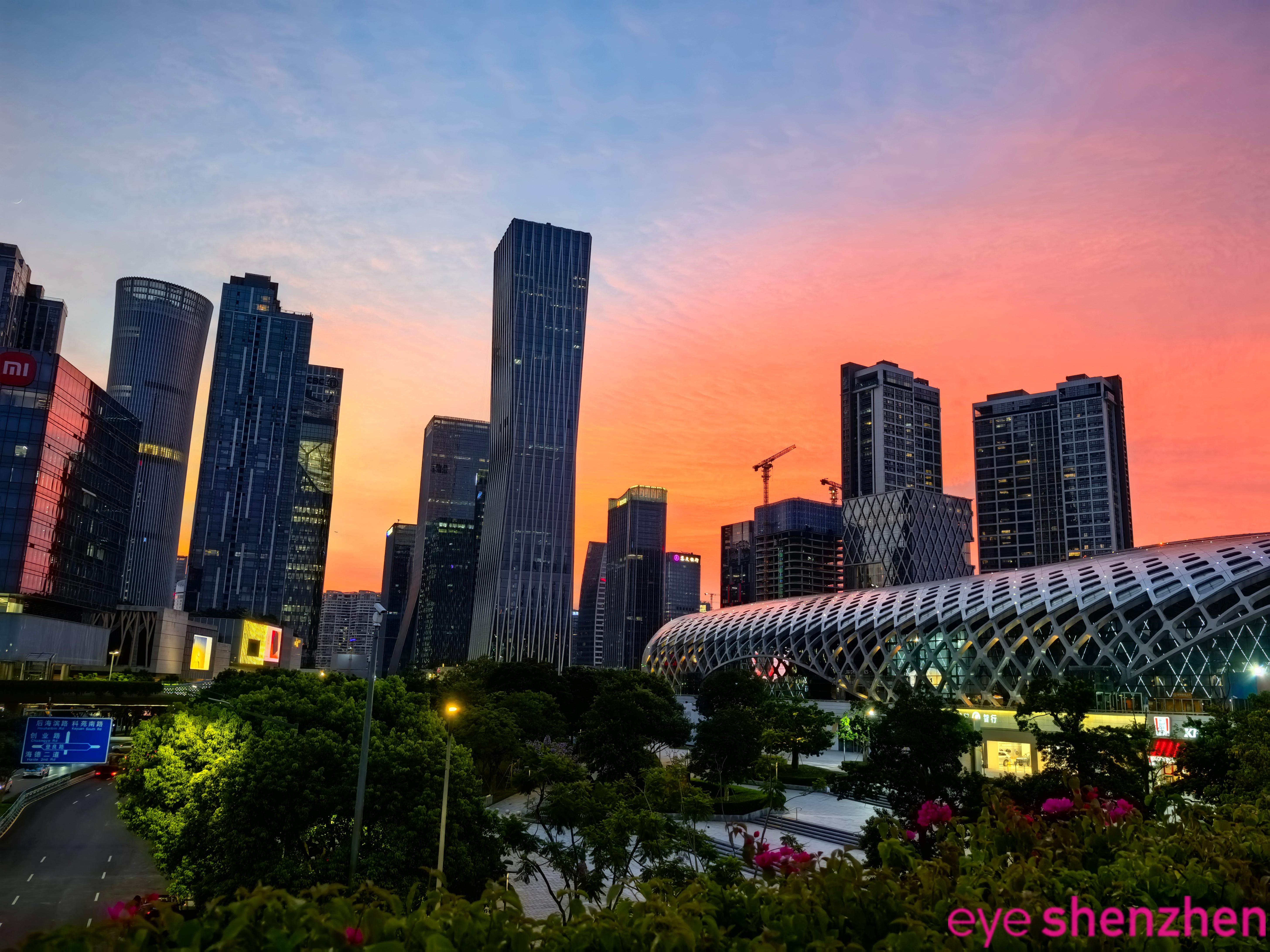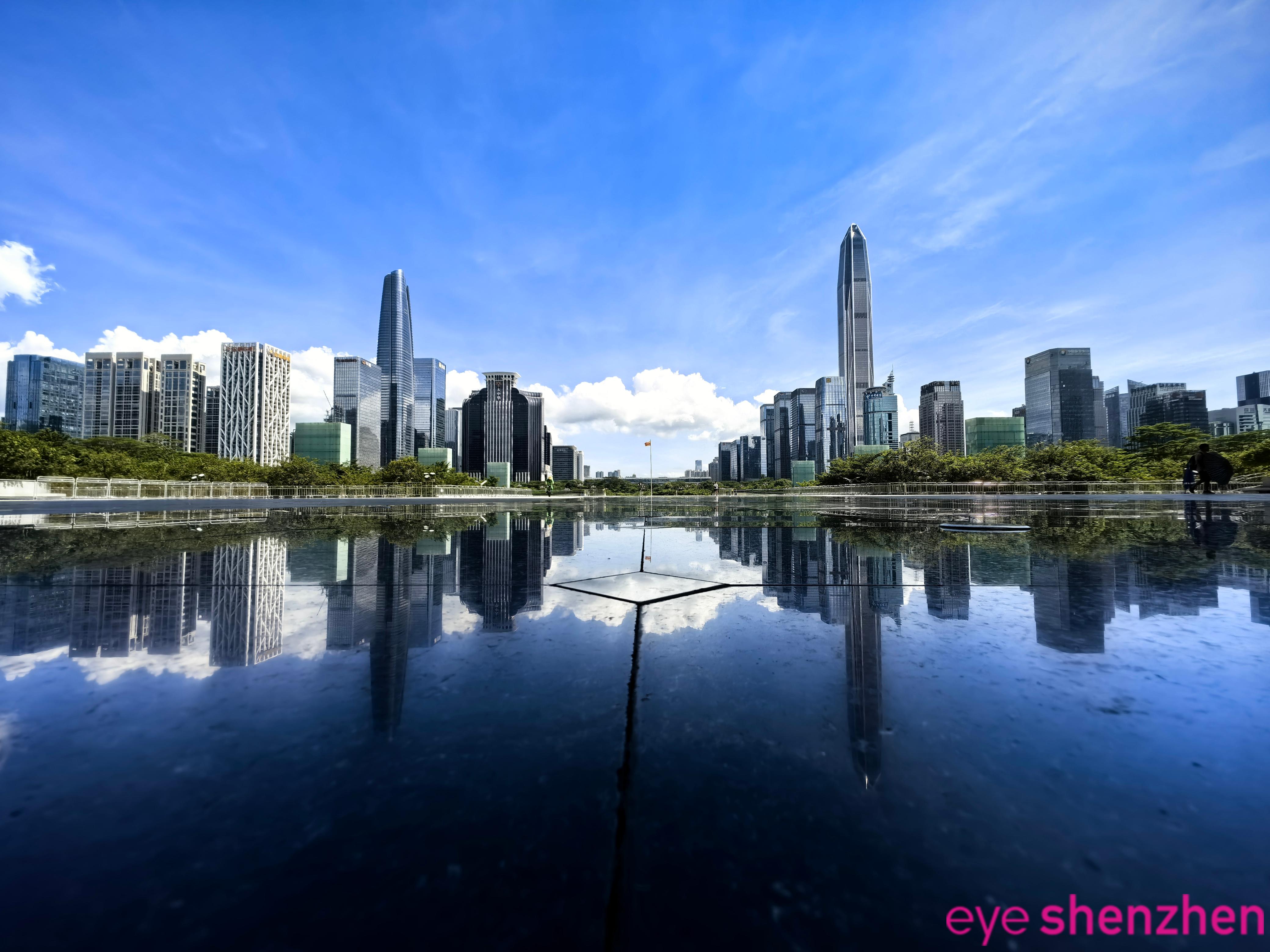 Urban skyline of Futian reflected on the floor of Shenzhen Civic Center