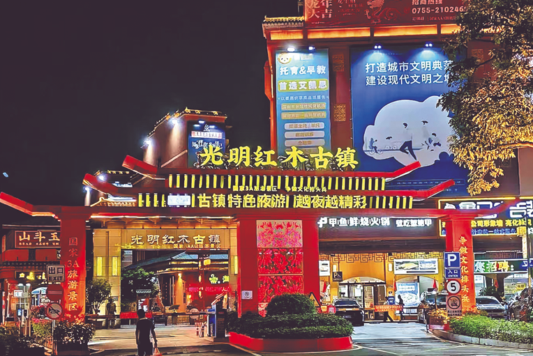 Guangming Redwood Town is a haven for fans of mahogany furniture and crafts. The scenery is beautiful by day and dazzling at night, with a musical fountain creating colorful water columns.